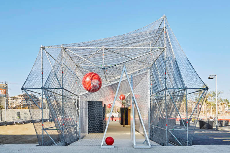 The building is defined by its layers of transparency consisting of a tubular metal superstructure, metal mesh and translucent polycarbonate panels which enclose the interior exhibition space, enclosed with a butterfly roof. The metal container houses the main programme, an information point. A timber floor lends an element of warmth to what is otherwise an industrial feeling artefact that could equally be defined as a piece of urban furniture. This simple volume nevertheless incorporates a series of architectural details including an inner lightwell, triangular shaped metal entrance gate and threshold as well as pop-art sculptural nods to the building’s programme which aims to provide citizens and visitors alike the opportunity to find out what the future holds for this rapidly evolving neighbourhood of Barcelona.